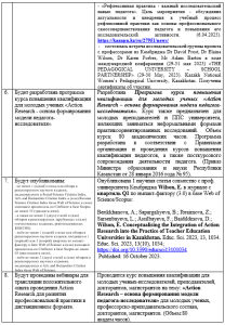 2. «Action research как форма профессионально-личностного развития педагогов». //Журнал «Обществознание и социальная психология» Выпуск №12 (42) 2022. Scientific Journal «KPO-SCIENCE» Issue №12 (42) 2022, РИНЦ. Стр.828-839. Авторы: 2. Берикханова А.Е., Байдильдинова Д.К., Сарсенбаева Л.О., Асилбаева Ф.Б., Сапаргалиева Б.О.